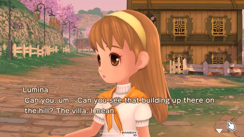 As you walk past the inn, a soft voice calls from behind—it’s Lumina. She catches up and asks if you remember her from the day you arrived. She lives in the villa with her aunt and their butler.