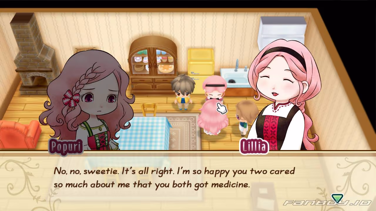 Then Popuri bursts into the house, shouting that she also bought medicine for her mom. It seems both siblings went out to get medicine for their mother. Now they have way too much medicine! Lillia’s happy that they both thought to buy her medicine and says she’ll use both.