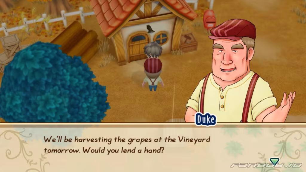 As you step outside your house in the morning, Duke will be waiting for you. He explains that tomorrow (Autumn 15), he will be harvesting grapes at the Adge Winery and needs some help. He offers to pay you for your work.