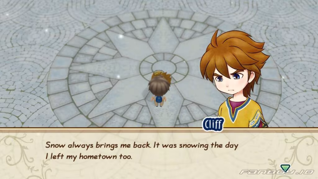 While walking through Rose Plaza, you see Cliff suddenly collapse in the middle of the square. He mutters that the white snow reminds him of the day he left his hometown. He drops a photo on the ground, which you pick up before heading to the inn to get help.