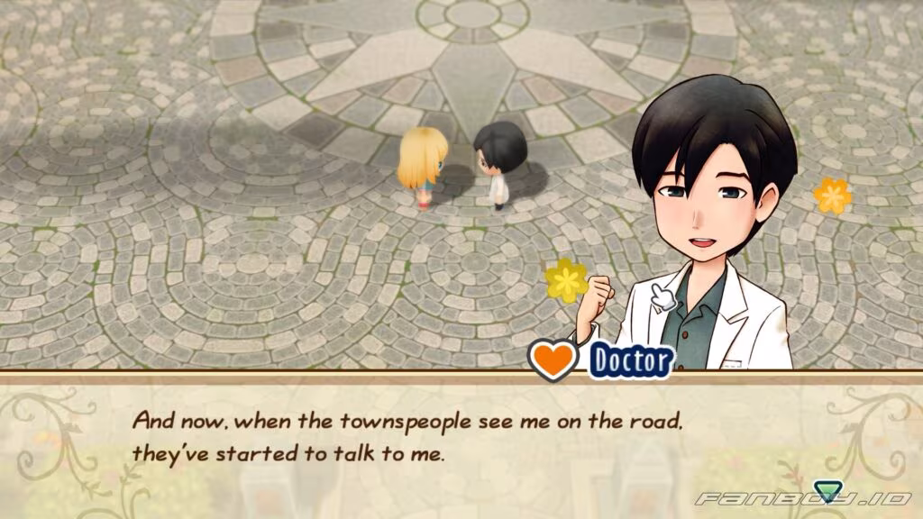 On Rose Plaza, you meet Mugi, who thanks Doctor for helping her recover. Doctor reminds her to be careful. Then, you see Mayor Thomas, who praises Doctor’s new medicine for Lillia and notes Doctor spends more time with patients.