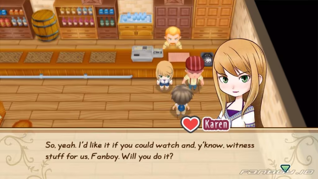 As you enter the bar area of the Inn, you see Duke and Karen sitting together. Karen explains that Duke has racked up quite the tab at the general store, so they’ve agreed to settle the debt with a juice-drinking contest.