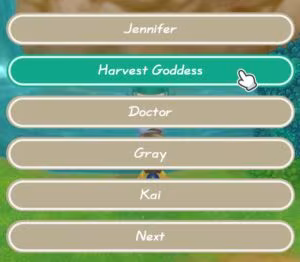 - You must choose “Harvest Goddess” from the list. If you choose someone else, you’ll be locked out of marrying her permanently.