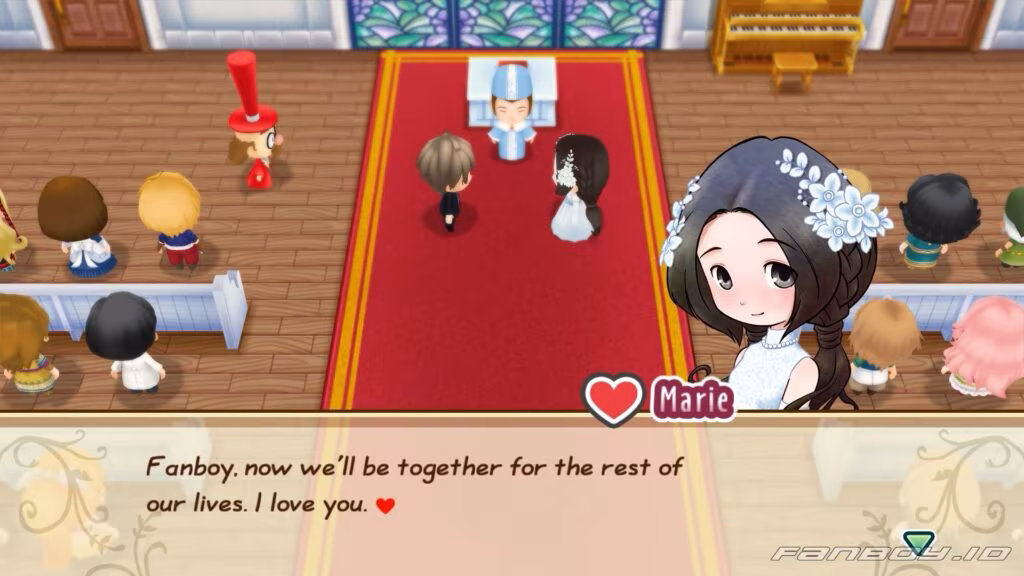Once you’ve seen all of Marie’s heart events up to the Orange Heart, you can propose with the Blue Feather to marry her.