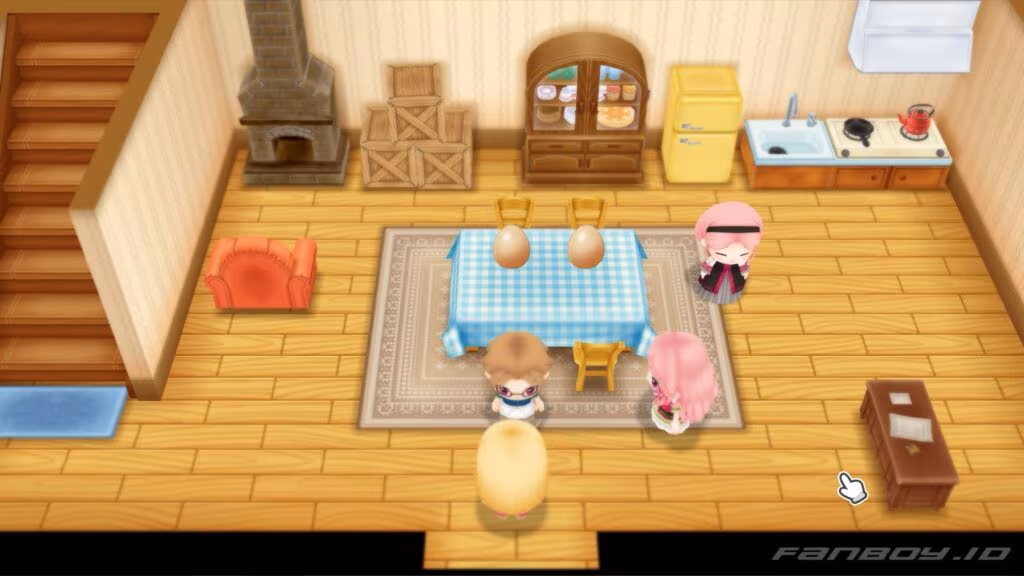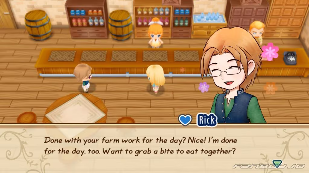 Rick is busy and a bit annoyed you snuck up on him but happy you came. He finished inventory and needs to care for the chickens. He can’t find Popuri, so you offer to help.
