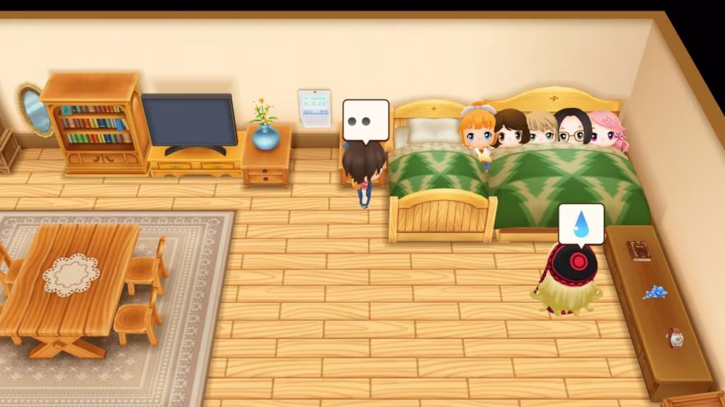 Soon after, Marie, Karen, Elly, Ran, and Jennifer also arrive. Popuri explains they heard you bought a big bed. Ran has never seen such a big bed and wants to try it out.