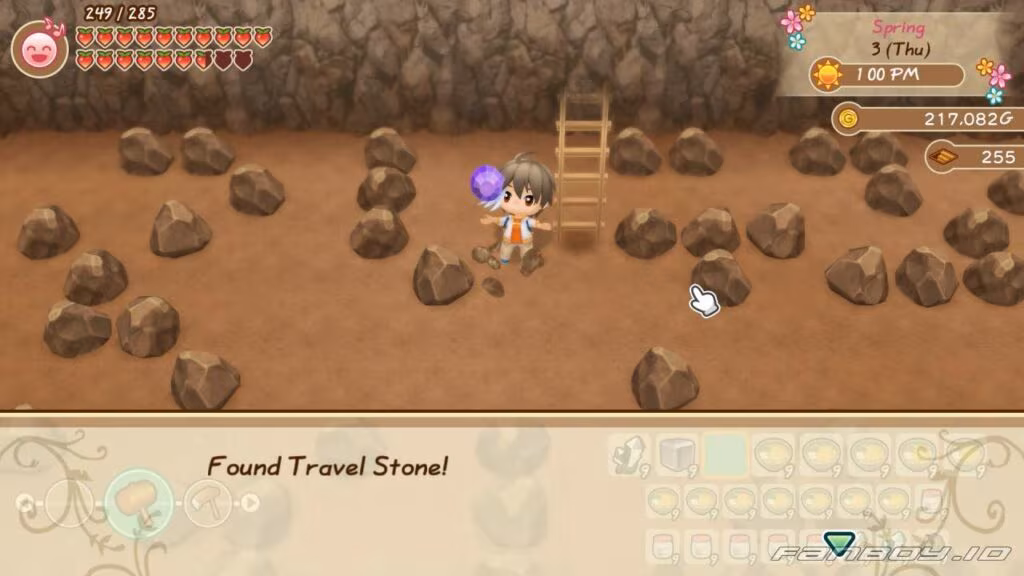 The most powerful item in the game, the Travel Stone, can be found in rocks on Floor 255, starting in Year 3 or later.
